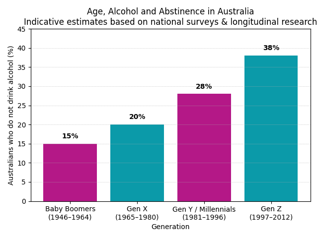 While all generations are adopting the trend to various degrees, the shift isn’t happening evenly. Younger generations are leading the change, while older Australians are moving more slowly, as seen in these estimated figures (based on a review of recent studies).